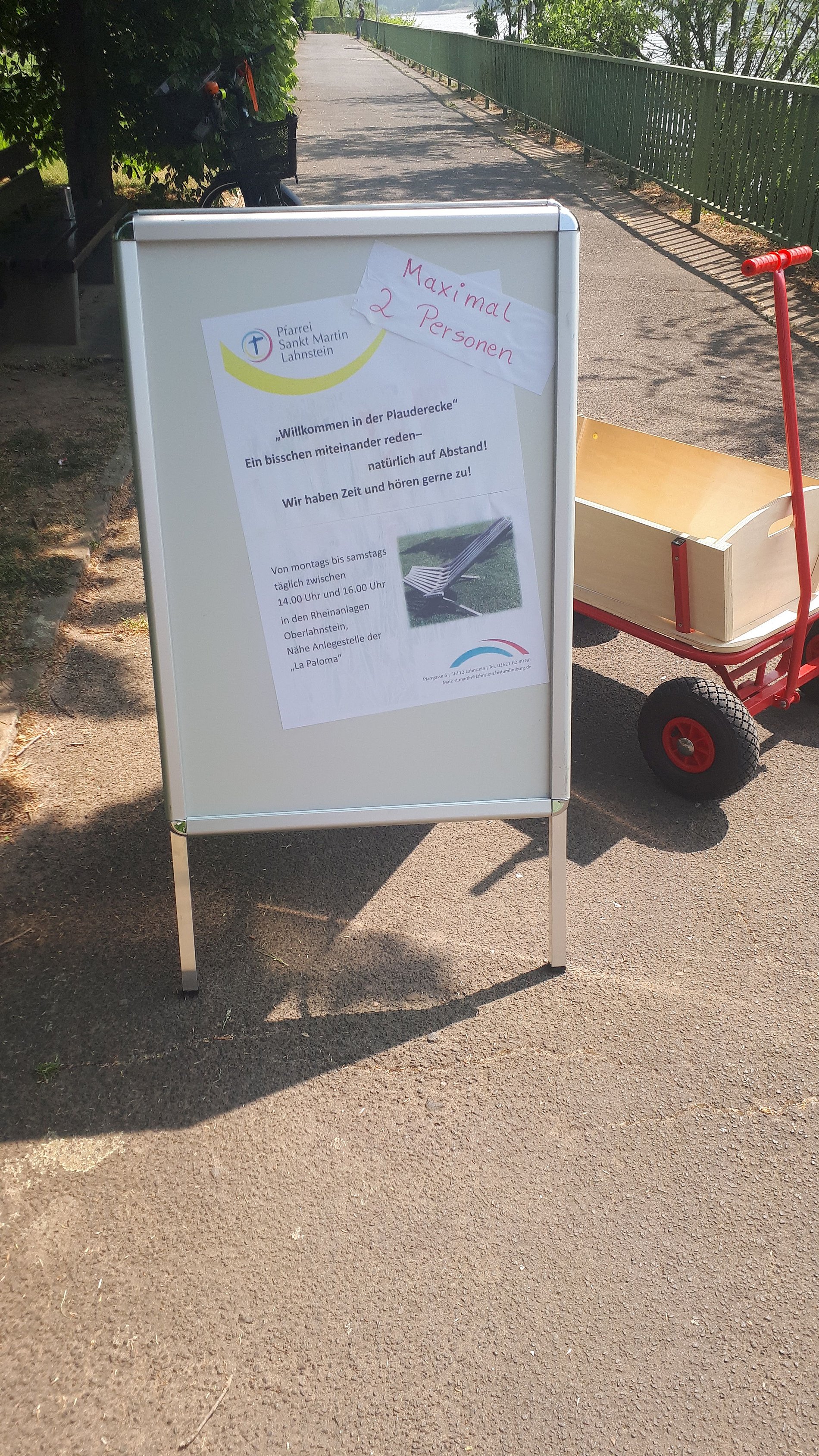 Ein Gesprächsangebot mit dem Namen „Plauderecke“ findet seit der Osterwoche in der Pfarrgemeinde St. Martin in Lahnstein große Resonanz. Sie wird täglich außer sonntags von 14.00 Uhr bis 16.00 Uhr in den Rheinanlagen in Lahnstein angeboten.