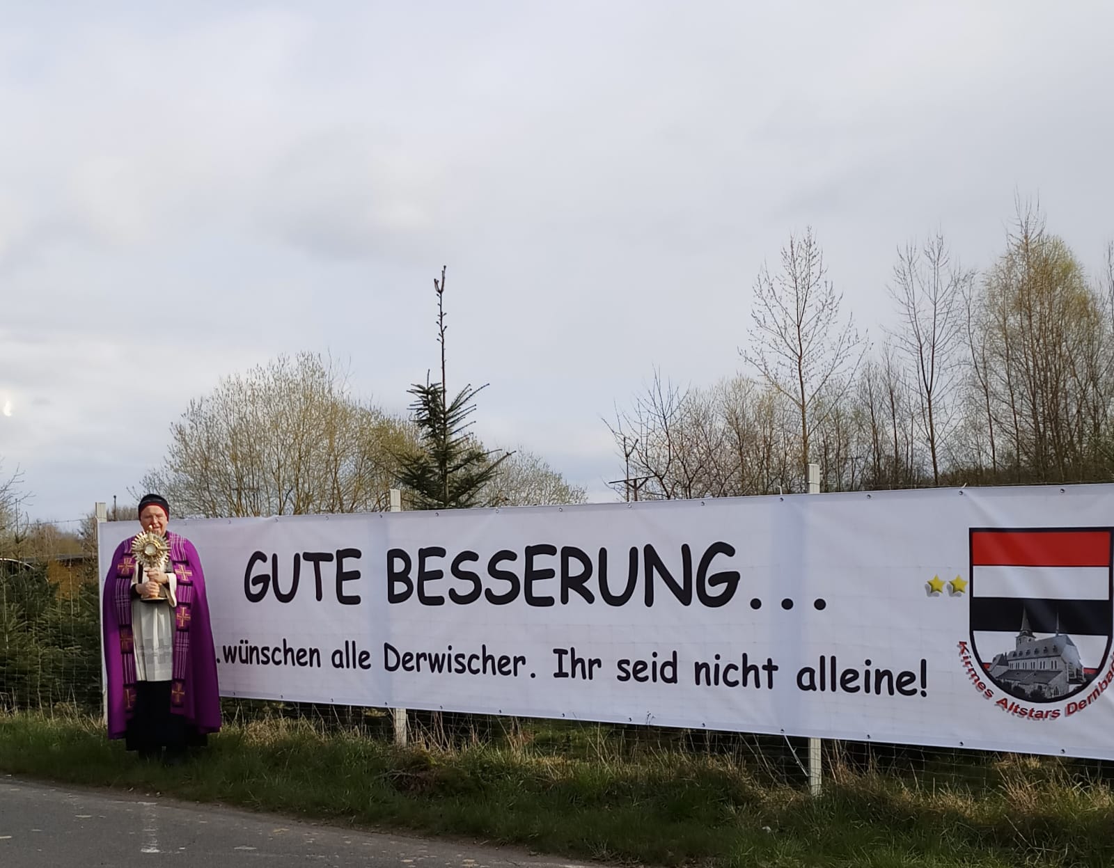 Seit kurzem sind Plakate beim Krankenhaus zu lesen, mit denen sich die Dernbacher an das medizinische Personal wenden und dessen Einsatz würdigen. Das „Gute-Besserung“-Plakat war so angebracht, dass die Patienten auf der Ostseite des Krankenhauses durch das Fenster die Ermunterung lesen konnten. Ermunterung – das war auch das Stichwort, wie so mancher Passant den Einsatz mit der Monstranz würdigte und sich freute.