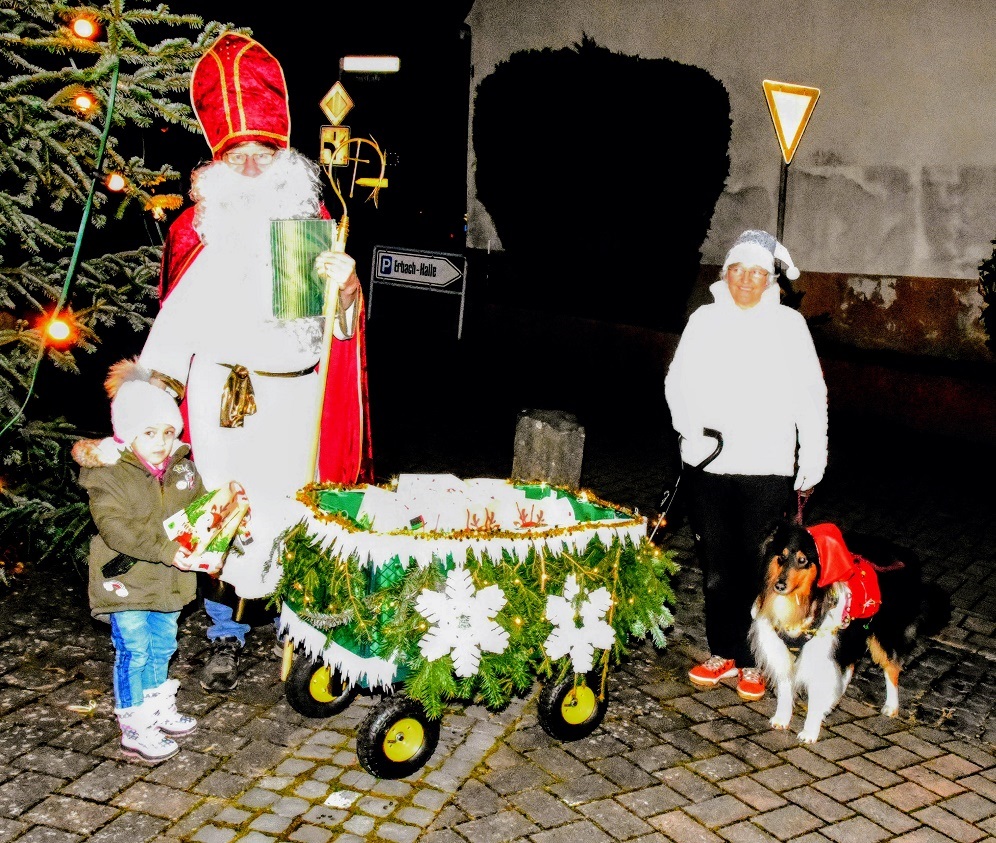 Wie im letzten Jahr war die Veranstaltung wegen Corona-Maßnahmen in der bisherigen Form nicht möglich. So entschloss man sich mit dem Nikolaus zu den Kindern an die Haustüre zu kommen. Im letzten Jahr wurde der Nikolaus in seinem Bischofskostüm von einem geschmückten Packpferd und einem Engel begleitet. Doch auch „Engel“ können schon mal krank werden und so wurde eine andere Lösung gesucht. Ein weihnachtlich geschmückter Handwagen, gezogen von Bettina Schneider und dem Hund „Kofi“, begleiteten den Nikolaus Bruno Schneider fast drei Stunden lang durchs Dorf, um die 35 Kinder zu besuchen. Auf dem Wägelchen befanden sich die 35 prall gefüllten Nikolaustüten, die viele Kinderaugen erstrahlen ließen. Den Anfang machte man bei der kleinen Melanie Grabert und danach ging es an die weiteren Haustüren, an denen schon manches Kind sehnsüchtig wartete. Nach drei Stunden war die Runde abgeschlossen und hatte vielleicht ein wenig Licht in die dunkle Jahreszeit gebracht.