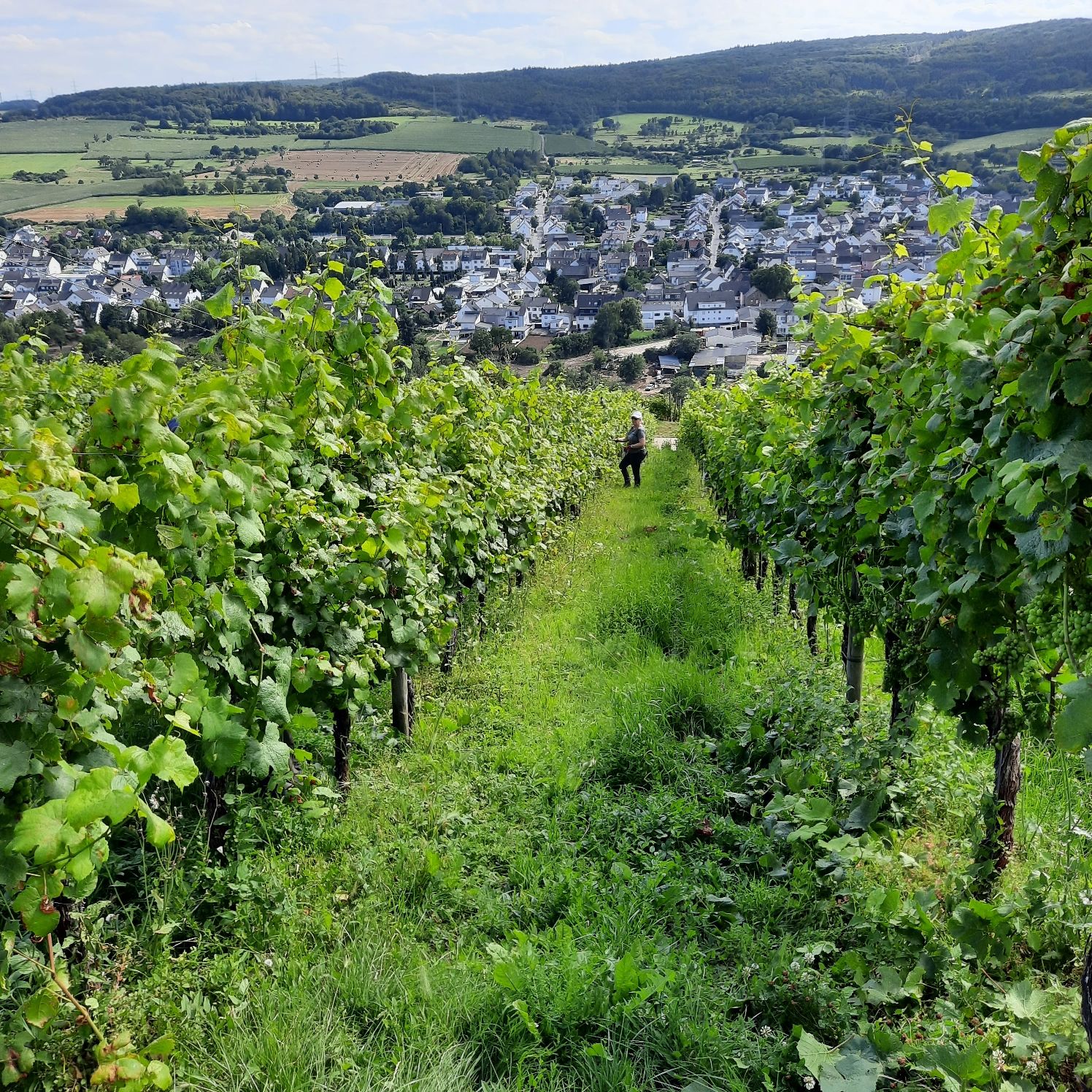 Heimersheim ist ein Ortsteil von Bad Neuenahr-Ahrweiler und zählt etwas mehr als 2000 Einwohner. Mit unserem Bus wurden wir zum Weingut Nelles gefahren, um dann weiter zum Einsatz in einen Teil des 6,5 Hektar großen Weinberges zu gelangen. Hier starteten wir mit unserer Arbeit, ähnlich wie die Arbeiter im Weinberg aus dem Gleichnis nach Matthäus (20, 1-16). Bei starker Hitze wurden die Rebstöcke vom unteren Blattwerk befreit, damit die Trauben genügend Sonne erhalten, aber noch genug geschützt sind vor „Sonnenbrand“. Es war für Büromenschen eine anstrengende körperliche Arbeit, aber wir waren glücklich und zufrieden, dem Winzer, der durch die Flutkatastrophe mit Haus und Hof schwer in Mitleidenschaft gezogen wurde, etwas unterstützend zu helfen.
