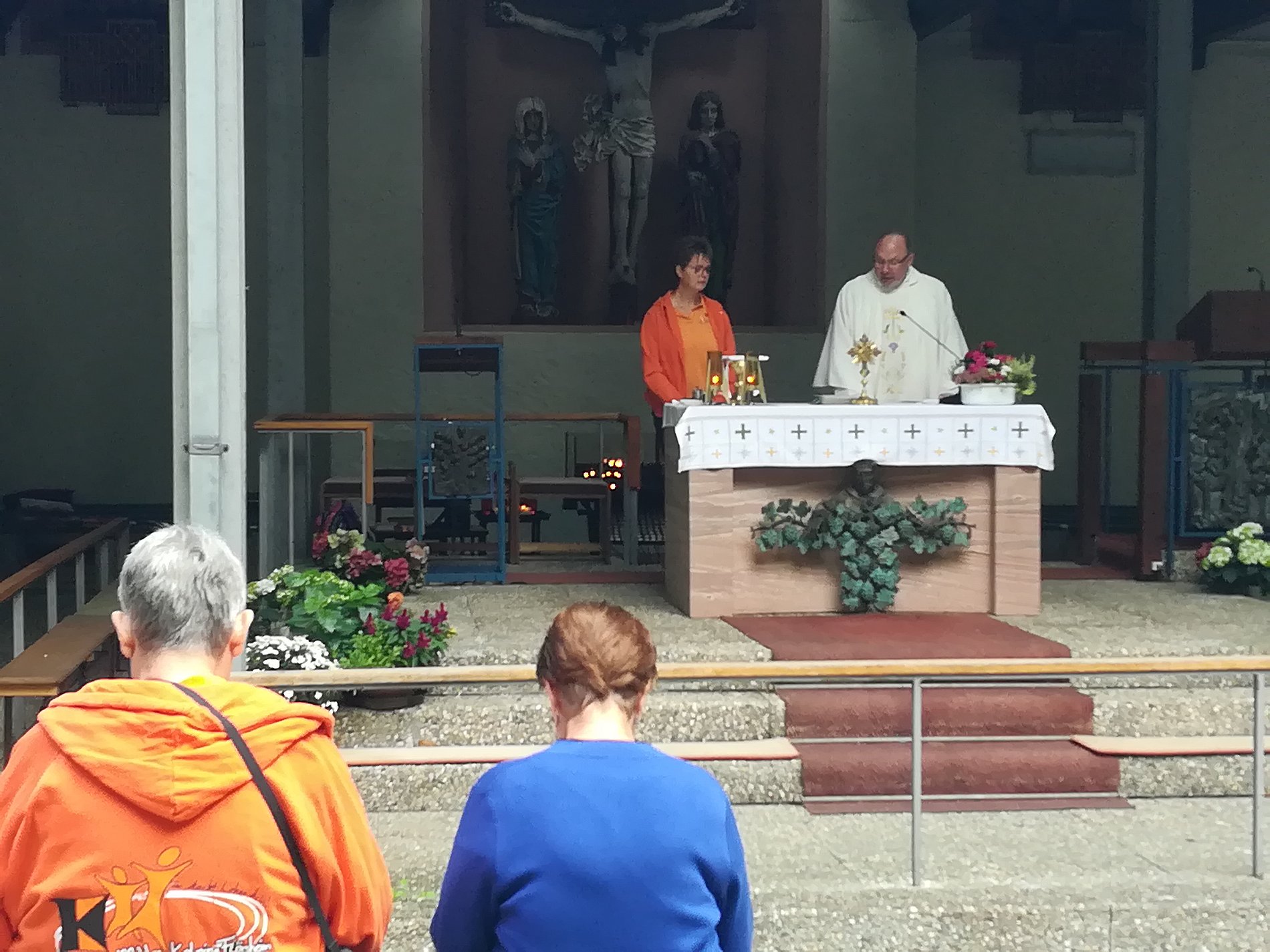 Zurück am Außenaltar wird gemeinsam Eucharistie gefeiert und das Kolpinglied "Wir sind Kolping" zum Abschluss gesungen. Doch damit war der Tag nicht zu Ende. Die einzelnen Kolpingfamilien trafen sich noch zum gemütlichen Beisammensein.
