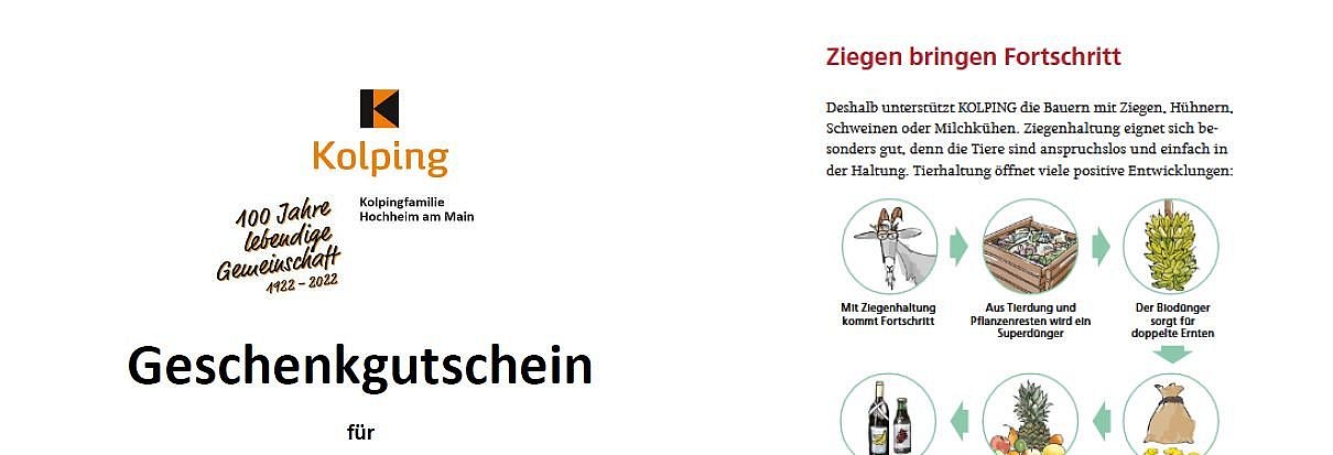 100 Jahre Kolping Hochheim - 100 Ziegen für Afrika. Unter diesem Motto startet das diesjährige Jubiläumsprogramm von Kolping Hochheim. Während die weiteren Aktionen und Festivitäten noch unter Corona-Vorbehalt stehen, möchte Kolping Hochheim das Jubiläumsjahr mit einer gemeinsamen Spendenaktion starten: Die Erlöse des ganzen Jubiläumsjahres sollen der Aktion 100 Ziegen für Afrika zugutekommen. Diese ermöglicht kleinbäuerliche Landwirtschaft am Existenzminimum in verschiedenen Afrikanischen Ländern; 40 € reichen aus für die Anschaffung einer Ziege, ein Ferkel bereits für 20 €. Für viele Menschen ermöglicht eine solche Spende den Aufbau einer lokalen Kleinst-Wertschöpfungskette, der Dünger hilft beim Anbau von Nutzpflanzen, Nachwuchs aus eigener Zucht kann verkauft werden.