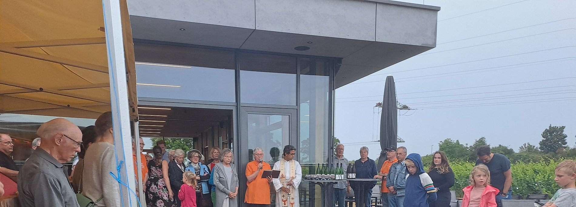 Dank der Vinothek konnte dem Regen getrotzt werden und ein geselliger Abend wurde verbracht. Für das leibliche Wohl sorgte das Team des Weinguts Schreiber, musikalische Unterhaltung brachten die Gäste selbst mit: Werner Weischenberg an Gitarre und Ukulele spielte zusammen mit Ralf Theis am Akkordeon. Im Anschluss gab Heribert Schlosser und Team (siehe separaten Bericht) den KolpingHochheim100JahreSong zum besten, eine Premiere zum diesjährigen 100-jährigen Jubiläum von Kolping Hochheim. Zur Segnung des Feuers durch Pater George wurde dann auch nochmals an die Jubiläumsaktionen erinnert: Unter anderem die Aktion Ziegen für Afrika von Kolping International wird aus Hochheim tatkräftig unterstützt und soll kleinbäuerliche Landwirtschaft in Afrika stärken. (mf)
