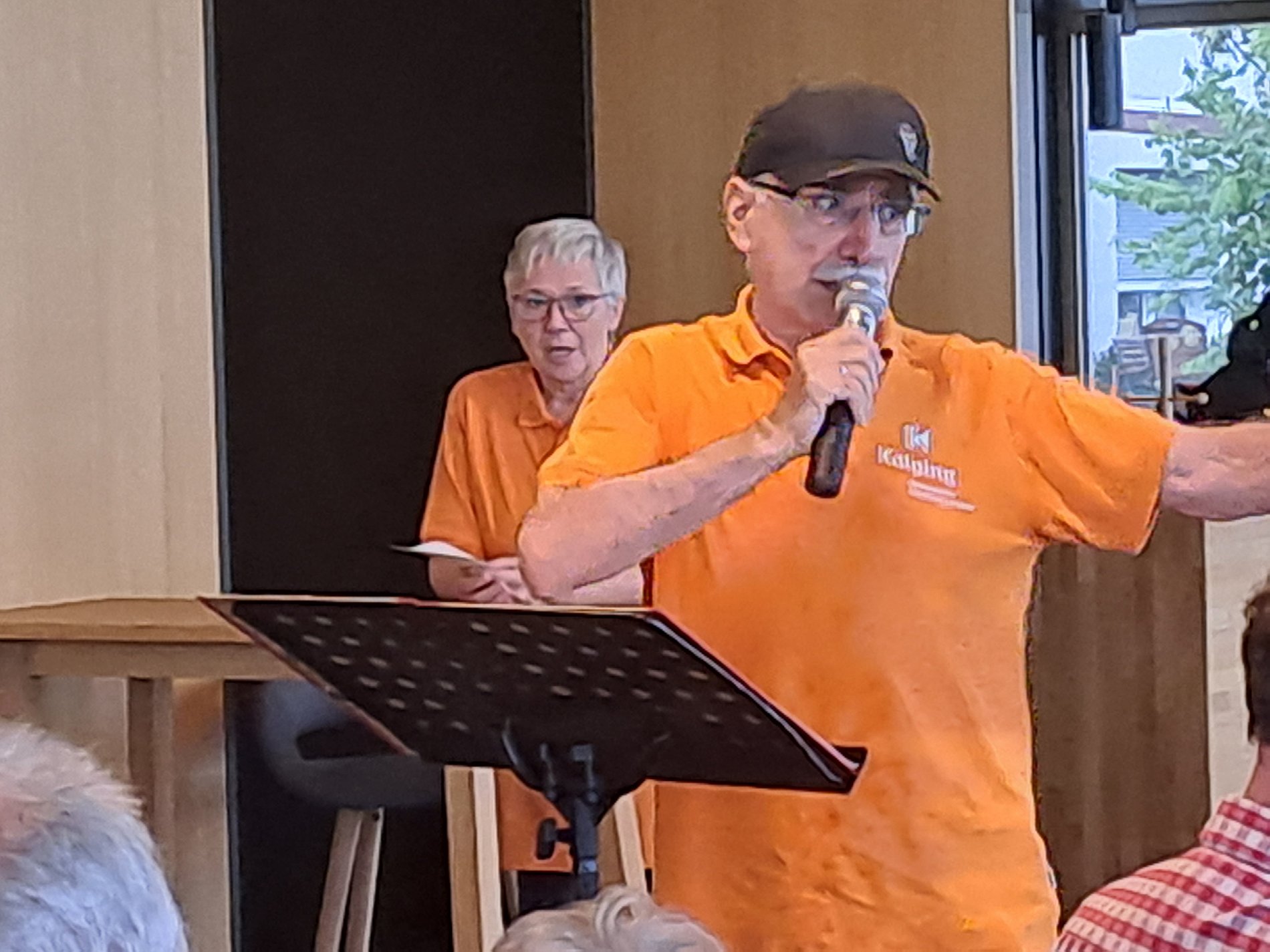 (Hochheim, 24.6.22) - Beim traditionellen Johannisfeuer im Weingut Schreiber feierte das neue Lied zum hundertsten Geburtstag der Hochheimer Kolpingfamilie seine Premiere mit zahlreichen Kolpingern und Gästen, die schon einige Verse des Refrains begeistert mitsangen. Geschrieben wurde es von Heribert Schlosser, der selbst schon sein „Platin-Jubiläum“ mit der Kolping Hochheim (55 Jahre Mitgliedschaft) feiern konnte.