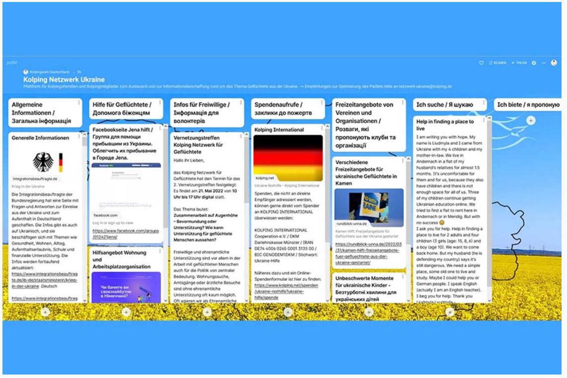 Ab sofort ist zudem eine neue Plattform für Informationen, Fragen, Angebote oder sonstige organisatorische Dinge zugänglich, die es ermöglicht, auch über mobile Geräte kurzfristige Aktionen zu organisieren, Anfragen zu stellen oder Unterstützung anzubieten. Das Kolping-Netzwerk Ukraine hat dafür ein „Padlet“ erstellt, welches über diese Adresse zu erreichen ist: https://padlet.com/Kolping_Netzwerk_Ukraine/dlhl0vmceq9pzr36