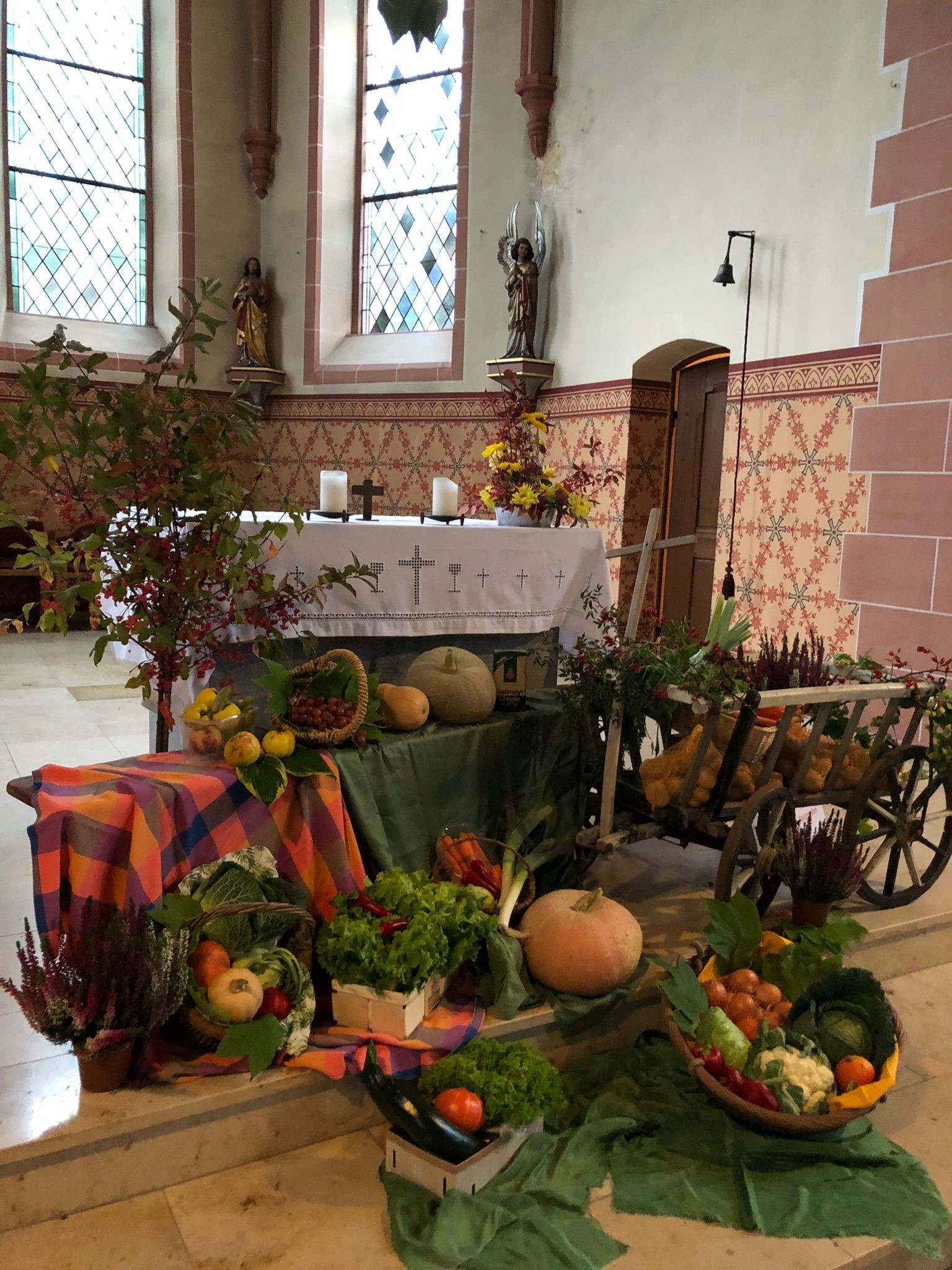 Der Bereich vor dem Altar von St. Pankratius war dementsprechend üppig mit all den Gaben geschmückt, den der Herbst derzeit den Menschen anbietet. Kürbisse, Äpfel, Birnen, Weintrauben, Kartoffeln, Blumenkohl und andere Kohlarten, Zwiebeln, aber auch gebackenes Brot gepaart mit Feldfrüchten boten ein üppiges Bild vor dem Altar. Die Kolpingfamilie hatte im Vorfeld ihre Gemeindemitglieder aufgerufen, all diese Gaben in die Kirche zu bringen. Da durfte auch eingemachtes Gemüse, Obst oder selbstgemachte Marmelade dabei sein.
