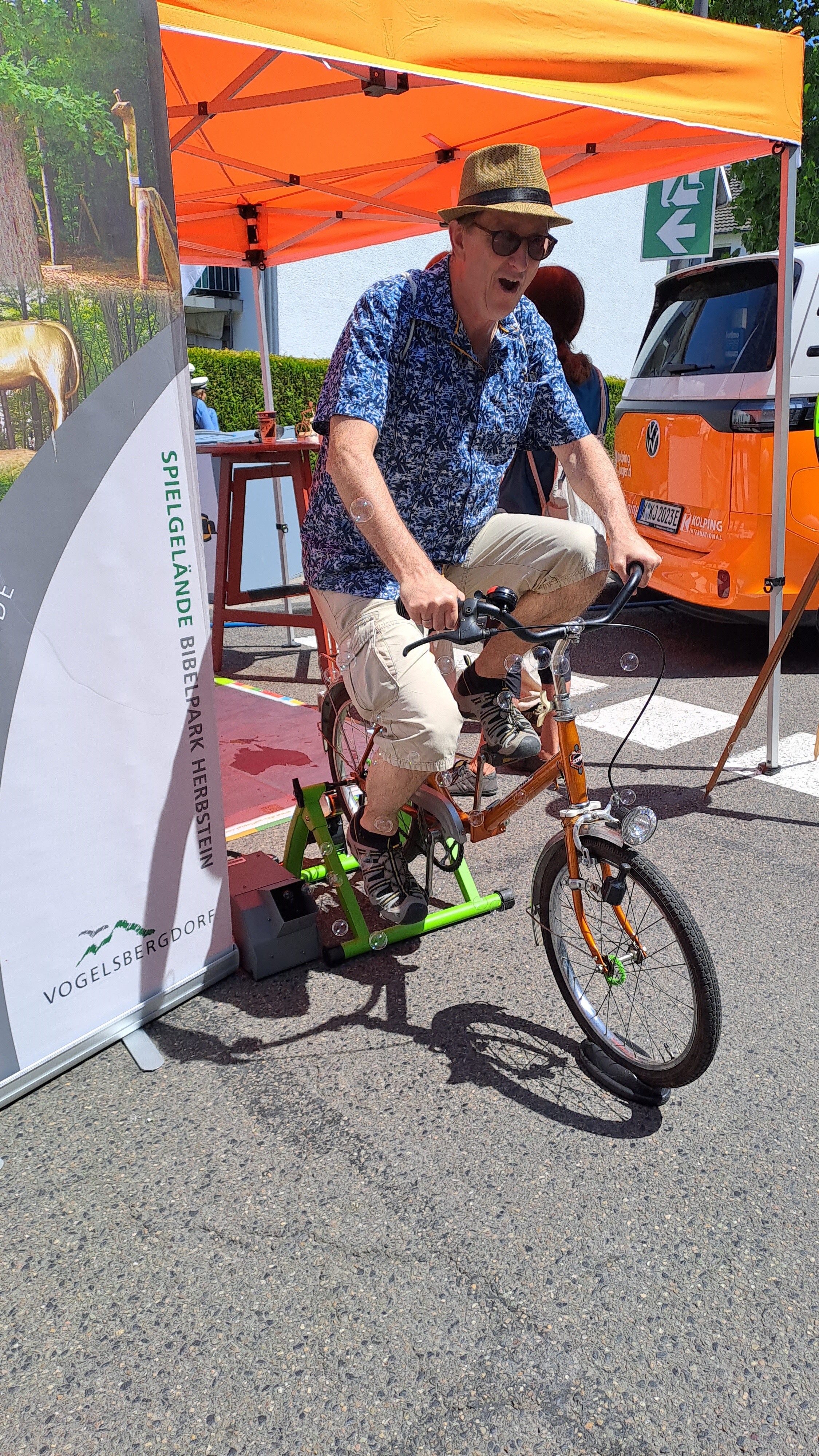 Beliebt war ein Fotoshooting mit dem Goldenen Kalb, das für Deutschlands ersten Bibelpark im Kolping-Feriendorf in Herbstein warb. Mit seinem zweiten Einsatz war das neue Klimamobil der Kolpingjugend Deutschland ebenfalls präsent und gab Informationen und Impulse zum Thema Klimaschutz. Interessierte konnten auf einem Fahrrad in die Pedale treten und selbstproduzierten Strom „erradeln“ – eine Gelegenheit, die sich unter anderem auch Sozialminister Alexander Schweitzer nicht entgehen ließ. Prominenten Besuch bekam der Kolping-Stand auch mit Innenminister Michael Ebling sowie Bischof Georg Bätzing und seiner Cousine Sabine Bätzing-Lichtenthäler, der SPD-Fraktionsvorsitzenden im rheinland-pfälzischen Landtag.