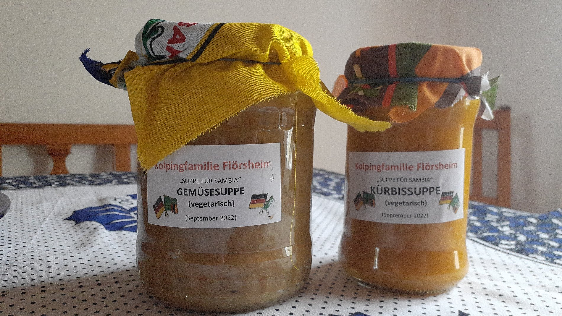 „Suppen für Schulbücher“- unter diesem Motto bietet die Kolpingfamilie Flörsheim im Rahmen ihrer 10-jährigen Partnerschaft mit der St. Charles-Lwanga-Gemeinde in Cipulukusu/Ndola in Sambia erstmals am Freitag den 13. Oktober 2023 auf dem Flörsheimer Wochenmarkt an der St. Galluskirche von 10.00 Uhr bis 15.00 Uhr leckere Gemüse- und Kürbissuppen im Glas oder zum Verzehr vor Ort gegen Spenden an.