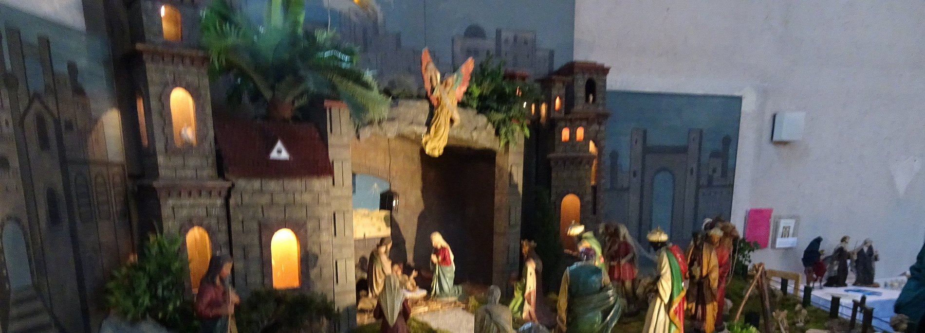 Am 8. Januar wurde die diesjährige Kolping Krippenfahrt unter der bewährten Leitung von Heinz Schlosser durchgeführt. Sie führte diesmal in den sogenannten Goldenen Grund, der sich ungefähr von Idstein über Bad Camberg hinaus bis nach Oberselters erstreckt. Mit dem Bus erreichten die 62 Teilnehmer der Fahrt gegen 12:00 Uhr die erste Station in Idstein, wo sie in der Pfarrkirche St. Martin von Pfarrer Kirsten Brast empfangen wurden, der sowohl die Baugeschichte der 1964 errichteten modernen und schlichten Hallenkirche als auch die Entstehung der Krippenfiguren schilderte. Diese wurden bereits in den 50er Jahren des letzten Jahrhunderts in einer Keramikkunstwerkstatt des Kannenbäcker Landes hergestellt. Wegen im Laufe der Jahre entstandenen Beschädigungen mussten immer wieder Figuren ersetzt werden, die sich aber in Größe und Ausführung von den älteren Figuren unterschieden, wodurch die Krippe heute zwar kein einheitliches Bild mehr ergibt aber doch einen eigenen Charme hat.