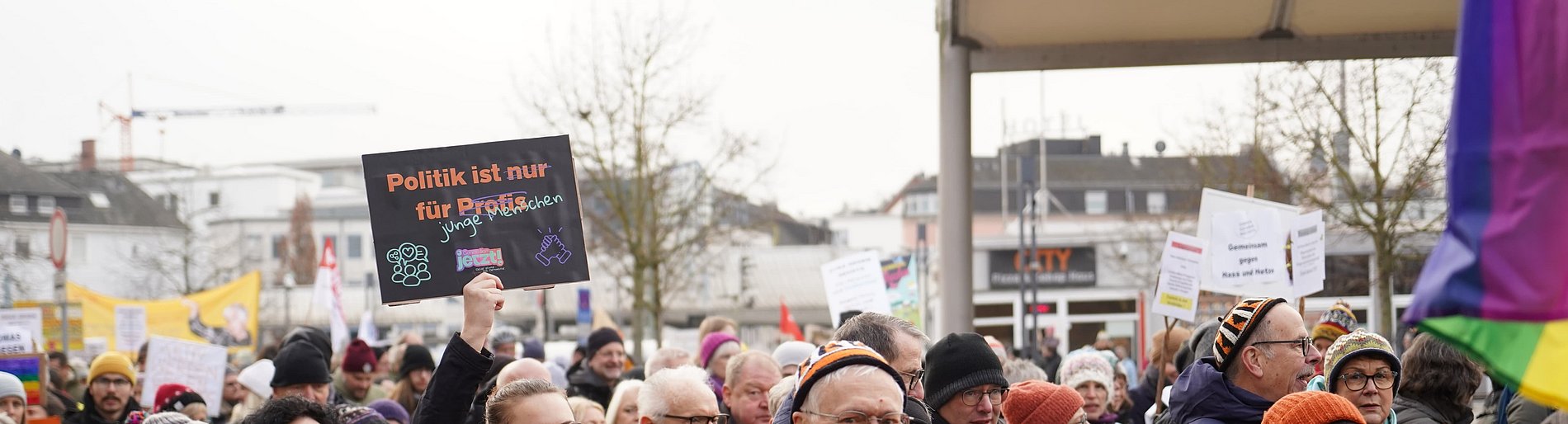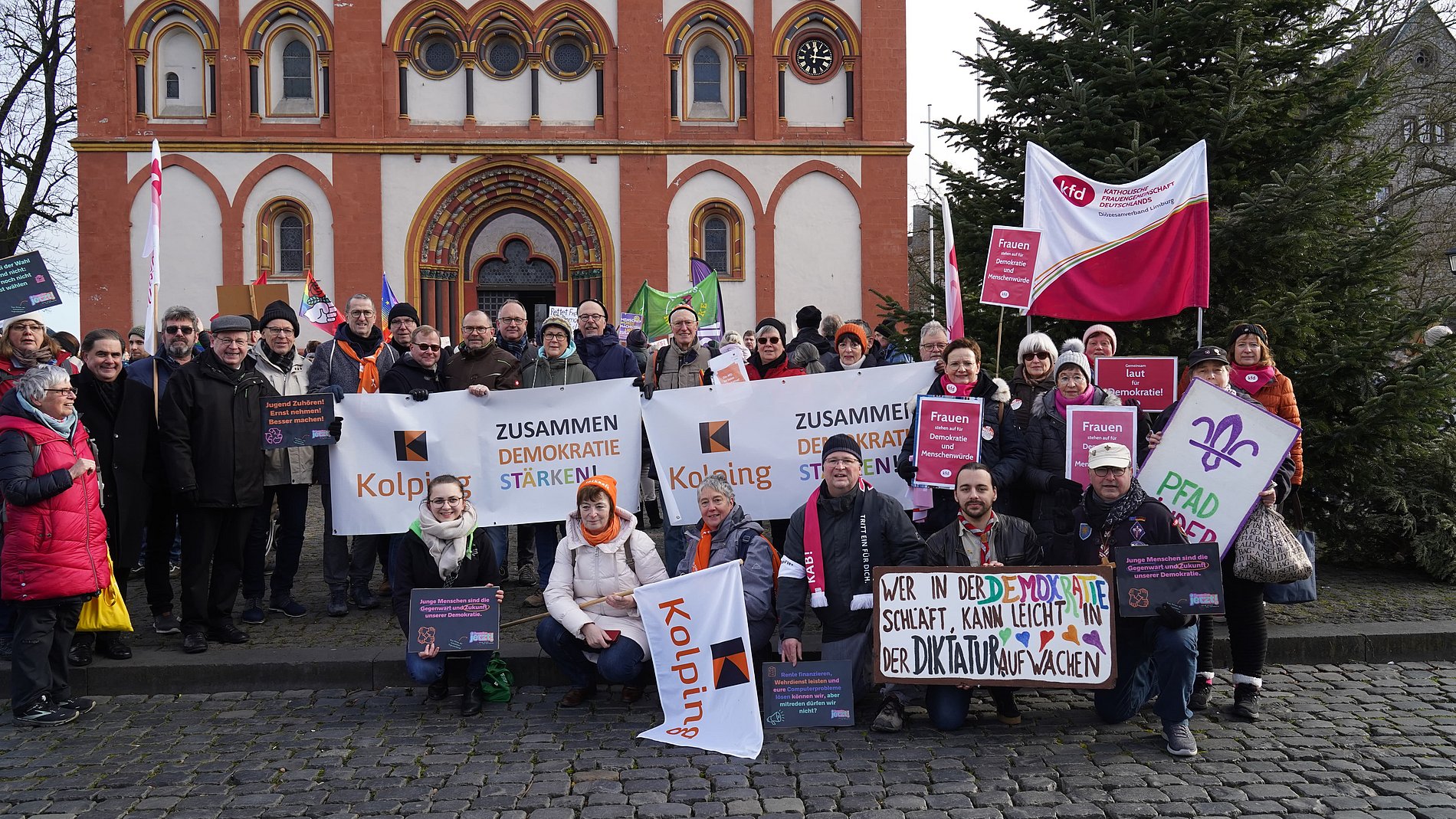 Limburg, 18.1.2025. - Heute haben wir mit anderen katholischen Verbänden die Demokratie-Demo in Limburg unterstützt. Wir halten zusammen, um gegen Fremdenhass, Intoleranz , Ausgrenzung und Faschismus anzutreten. Mit 1200 anderen Menschen sind wir durch die Limburger Strassen gezogen, um vor dem Dom zur Abschlusskundgebung gute Statements zur Stärkung unserer Demokratie zu hören. "Wir sind mehr!", sollten wir alle mit Deutlichkeit immer wieder zum Ausdruck bringen. Auch Bischof Georg Bätzing unterbrach seine Klausurtagung, um mit zu demonstrieren.