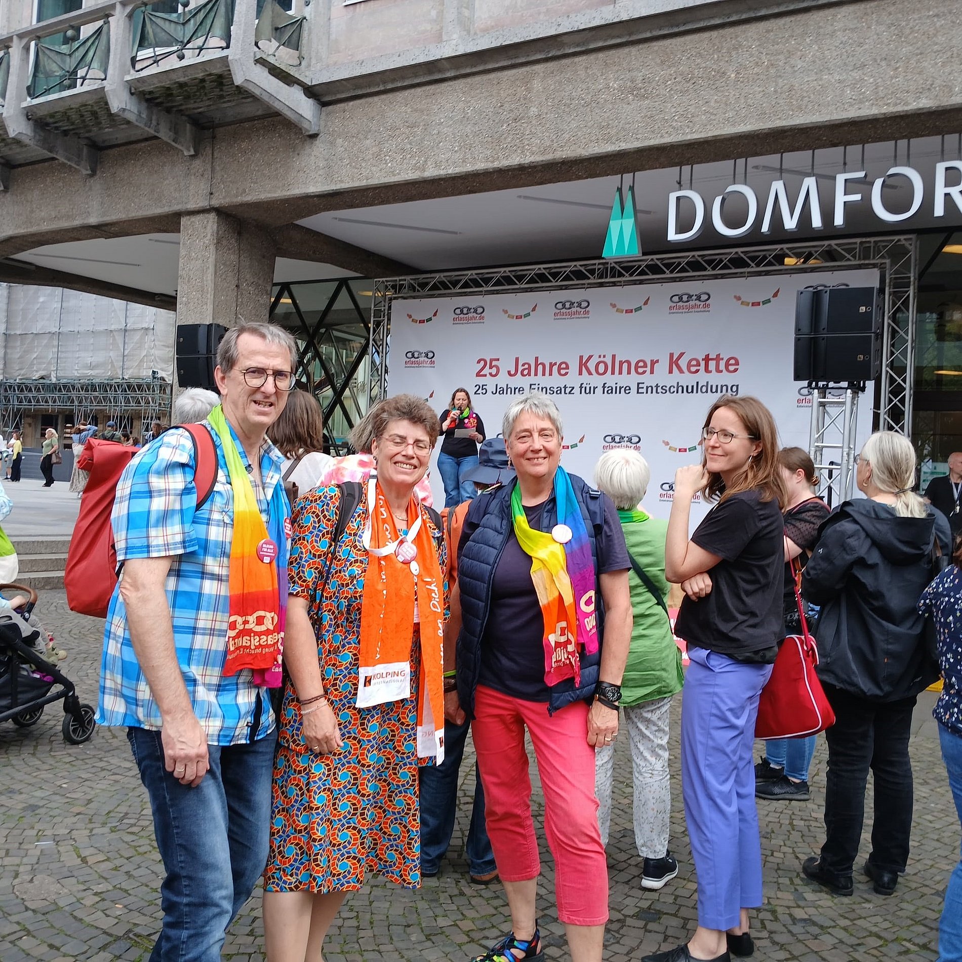 Daher wurde mit einem Aktionstag am 18. Juni an die „Kölner Kette“ als Meilenstein der globalen Entschuldungsbewegung erinnert (wegen der schlechten Witterungsverhältnisse kamen weniger Menschen als erwartet) und die Forderung nach fairer Entschuldung an die Bundesregierung erneuert. Der Aktionstag ist Teil der Kampagne „Mit Schulden fair verfahren!“, mit der erlassjahr.de die Bundesregierung auffordert, ihr Versprechen aus dem Koalitionsvertrag umzusetzen und die Schaffung eines Staateninsolvenzverfahrens zu unterstützen. Heute ist der Einsatz für faire Entschuldung angesichts der weltweiten Schuldenkrise dringender denn je! Daher beteiligen sich der Kolping Diözesanverband Köln, das Kolpingwerk Deutschland und KOLPING INTERNATIONAL an dem Aktionstag.
